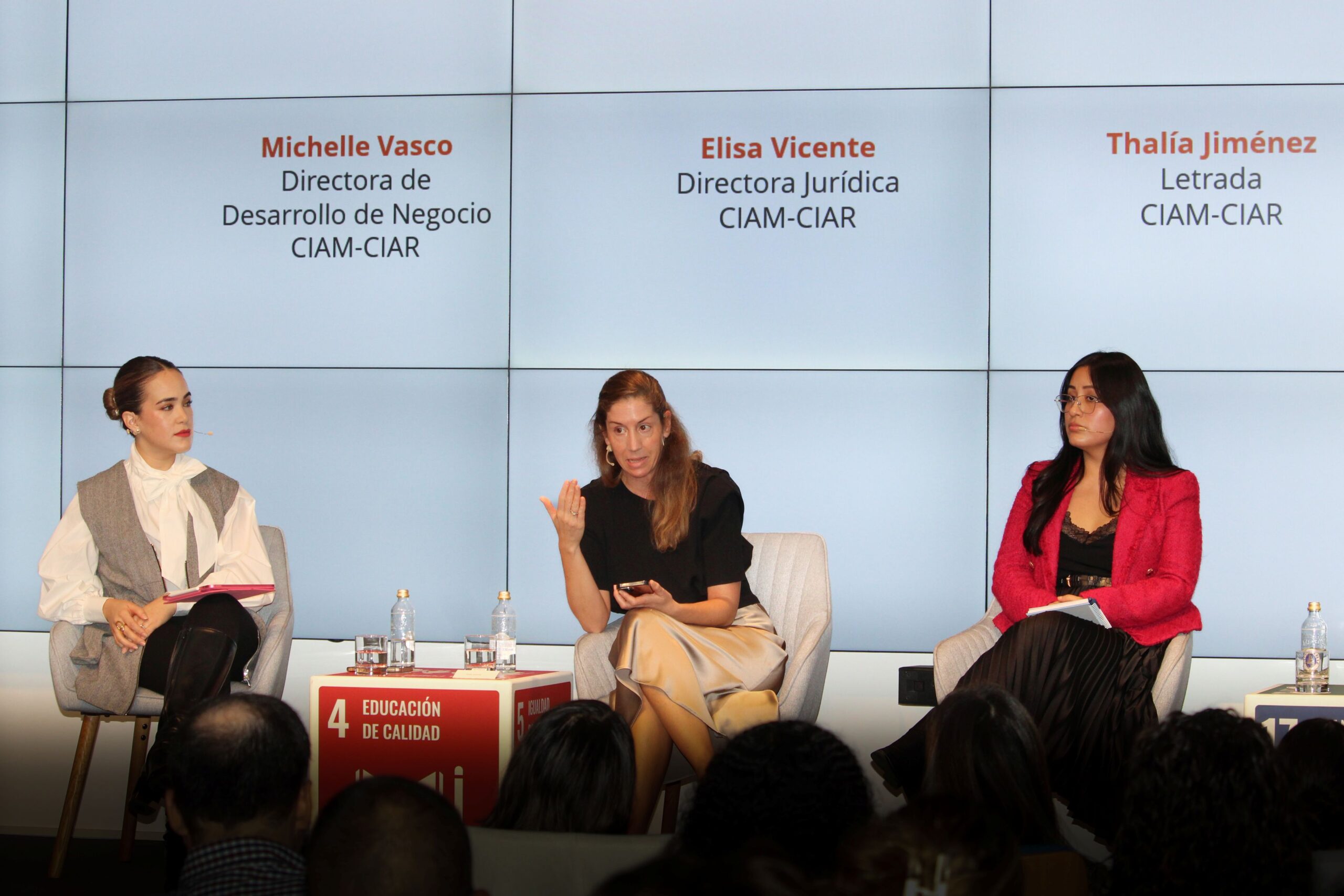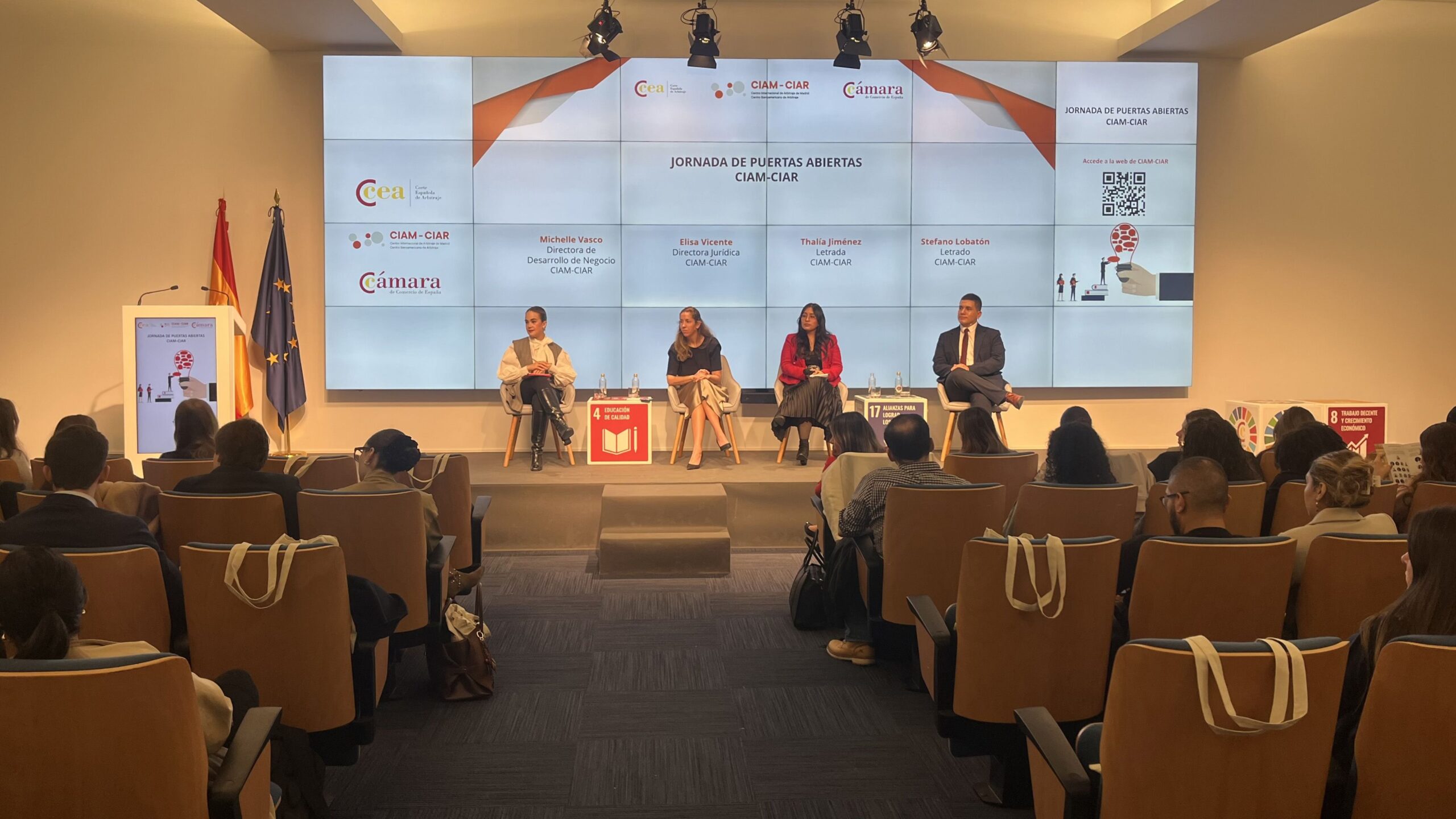 Tras la bienvenida, se ha dado la palabra a los cuatro representantes del Centro: Michelle Vasco, directora de Desarrollo de Negocio; Elisa Vicente, directora jurídica, y Thalía Jiménez y Stefano Lobatón, letrados del CIAM-CIAR.